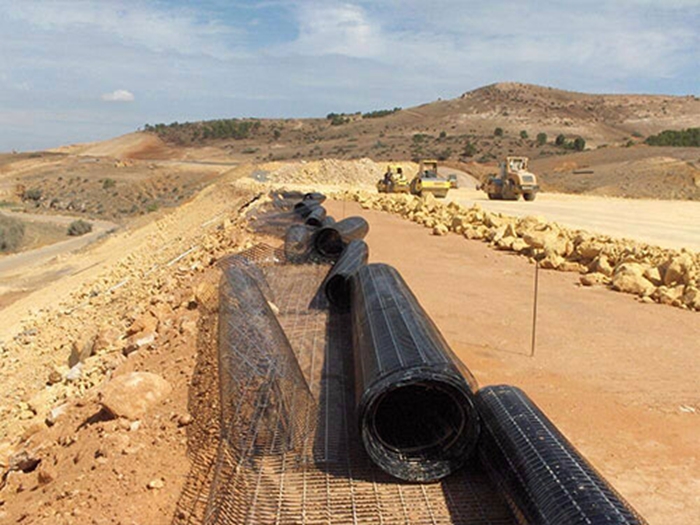 有時配合自粘感壓膠和表面瀝青浸漬處理,使格柵和瀝青路面緊密結合成一體。由于土石料在土工格柵網格內互鎖力增高,它們之間的摩擦系數顯著增大(可達08~10),土工格柵埋入土中的抗拔力,由于格柵與土體間的摩擦咬合力較強而顯著增大,因此它是一種很好的加筋材料。同時土工格柵是一種質量輕,具有一定柔性的塑料平面網材,易于現場裁剪和連接,也可重疊搭接,施工簡便,不需要特殊的施工機械和專業技術人員。